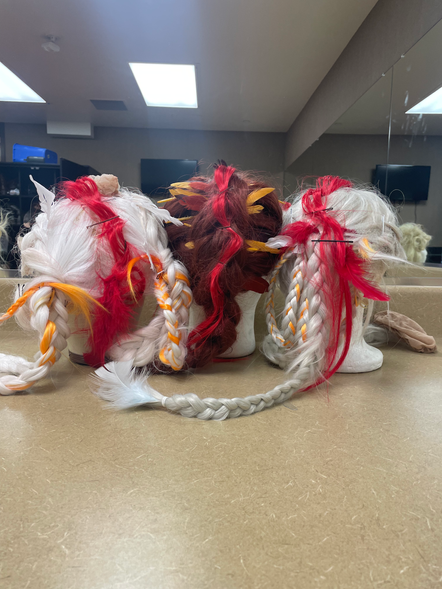 This show used 27 wigs total, 21 animal wigs, and 6 period styled wigs, 4 female and 2 male. Every wig used in the show was designed and styled by Vanessa, looking at animal silhouettes and color pallets as well as the way that the actors played the character in order to create a wig that matched each animal. The period wigs were only used in one scene at the end of the show, but they needed to be just as detailed to make the time period believable.
